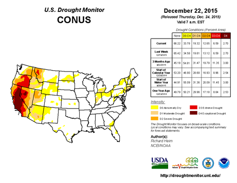 Another news story, from Last Resistance, reports that West Coast Ski areas are raking in the dough because of a record snowfall that MIGHT break the “exceptional” drought which has engulfed California, as shown in the map below from the 22nd (the new one is due out on the 31st), found at the University of Nebraska website.