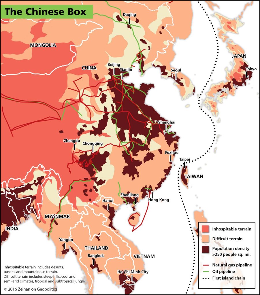 Peter Zeihan points out that China is in a box, as seen in the map below. This is galling for an imperial power.
