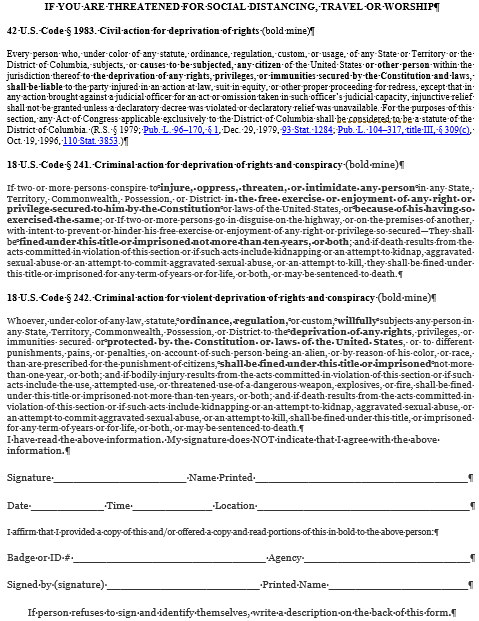 - If they refuse to accept it (they may be afraid of COVID-19), read the titles of the US Code (“LAW” or “STATUTE”) and the highlighted portions to them. Then get their personal information (name, agency, badge number, name of supervisor, address and phone or email contact.)