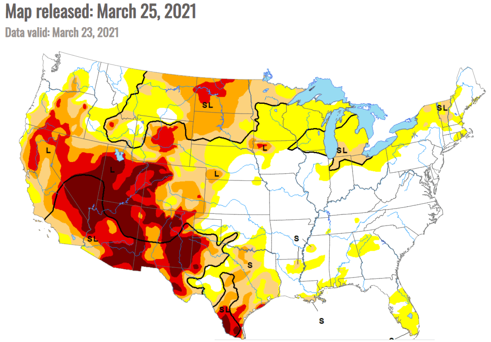 Looks pretty ghastly, doesn’t it? Nearly 2/3 of the Forty-Eight States are in some stage of drought, from “Abnormally Dry” (bright yellow) through “Exceptional drought” (dark red/black) both S – short-term and L – long-term. Even usually wet areas (with 30, 40, 50 inches of precip a year normally) are suffering this Spring. Summer will likely be worse. Much worse.