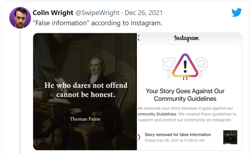Recently, I learned that a quote from Tom Paine was the excuse for Facebook and Instagram to block someone, as reported in American Military News.