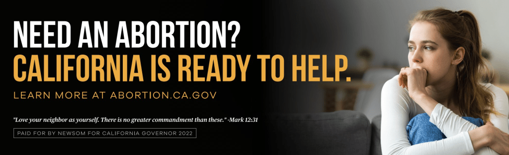 The Washington Times writes about this odd string of billboards. “Need an abortion?” billboards in Mississippi and Oklahoma ask. “California is ready to help.” The billboards contain Mark 12:31 that reads, “Love your neighbor as yourself. There is no greater commandment than these.” The implication, of course, is that abortion is somehow an act of love – or, at the least, California sees itself as compassionately offering a “service” to non-resident women from the evil States that believe abortion itself is evil.