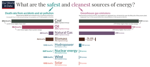 We all know the adage: there are lies, d**ned lies, and statistics. In this case, it is what is and is not counted that turns charts like this into a big lie. The emissions and death rate in the chart are for operations and maintenance: mining and transporting the coal, drilling and producing and refining and transporting the oil and gas, planting and harvesting the biomass. The numbers do NOT include the costs of constructing the plants themselves – including the costs of mining the materials needed to produce the plants themselves: the rare earths, the copper, the other metals, the concrete and everything else. And of course, other environmental and social impacts are ignored.