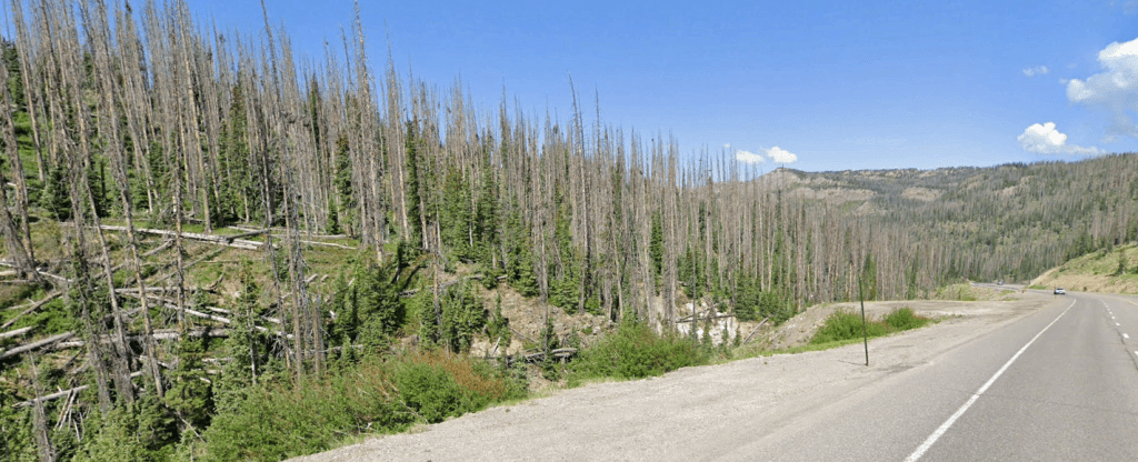 Every few years, yet another huge chunk of fire-climax forest deprived of the beneficial aspects of “natural wildfire” gets burned up. Below is an example of one we here at TPOL have been waiting to explode for 25 years: this is on the south slope of the famous Wolf Creek Pass in Colorado.