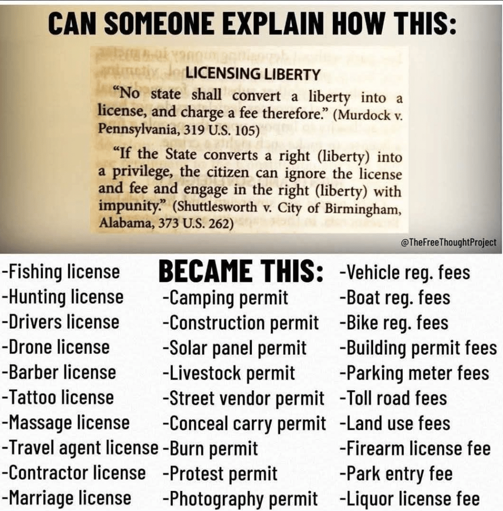 All those fees listed in the poster are not based on enumerated rights as stated in the US Constitution (or State constitutions). Now, the 9th Amendment should be considered. But here we have run into big problems. The 9th Amendment is not claimed or cited very often. In fact, it appears that the 9th Amendment has been considered in very many cases at all. As of 1973 and a Denver Law Review survey, at least, only three significant cases were decided on the basis of the 9th Amendment. And they are, as things go, really minor: the right to privacy, first in marriages (regarding contraception) and then in a “right” to abort an unborn child (the infamous Roe v. Wade, now overturned). And a 1947 case (US Public Workers v. Mitchell) stated that the 9th and 10th Amendments do not limit federal power where it is otherwise granted by the Constitution (and apparently do not limit State’s powers at all). This, according to some, is interpreted as “limiting the 9th Amendment’s use for expanding rights beyond those granted by the government.”