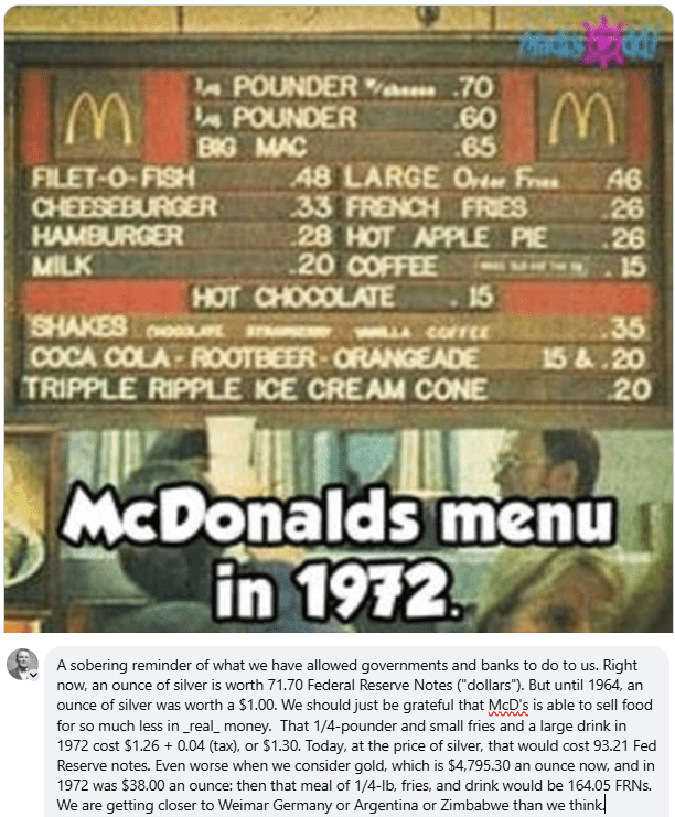 Inflation is indeed a killer. It is only the incredible productivity of even our badly-perverted and severely-damaged free market economy that makes a Quarter-pounder meal cost “only” somewhere between $9.00 and $12.00 (well, FRNs).Plus sales tax, as government rip us off for another 6-10% (between 54 cents and a dollar-twenty more). We can count our blessings that we are only paying TEN times what that same food cost a half-century ago.