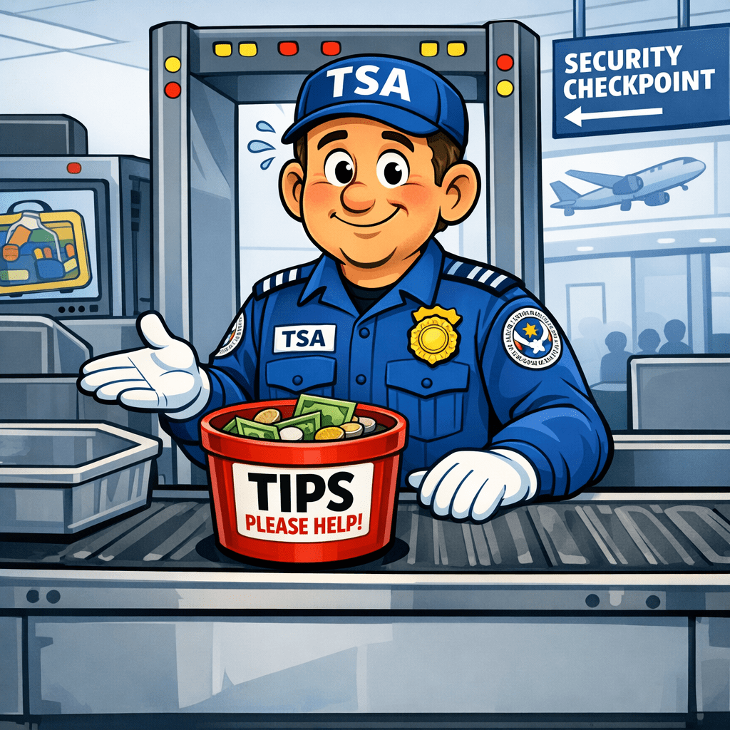 From the Rapid City Regional Airport in the Black Hills of South Dakota, we have a “NextDoor” posting. We are reminded that (courtesy of Congressional wrangling and other factors), DHS has not been funded. So your friendly airport trolls in TSA get-up are not getting paid. So, the poster tells us, travelers in and out of the airport are asked to drop a few dimes (or dollars) into tip baskets to give a little help to the unpaid TSA agents for pawing through your luggage, your carry-on, powering up your laptop, making you take your belt buckle and shoes off, and wanding you so that you can fly to visit Aunt Ginnie in Seattle or Houston.